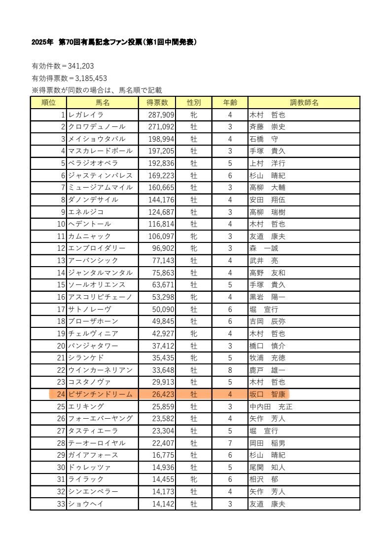 2025年有馬記念ファン投票第1回中間発表F馬順位 25位 エリキング 25,859票 26位 フォーエバーヤング 23,582票 32位 シンエンペラー 14,173票 65位 ボンドガール 2,984票