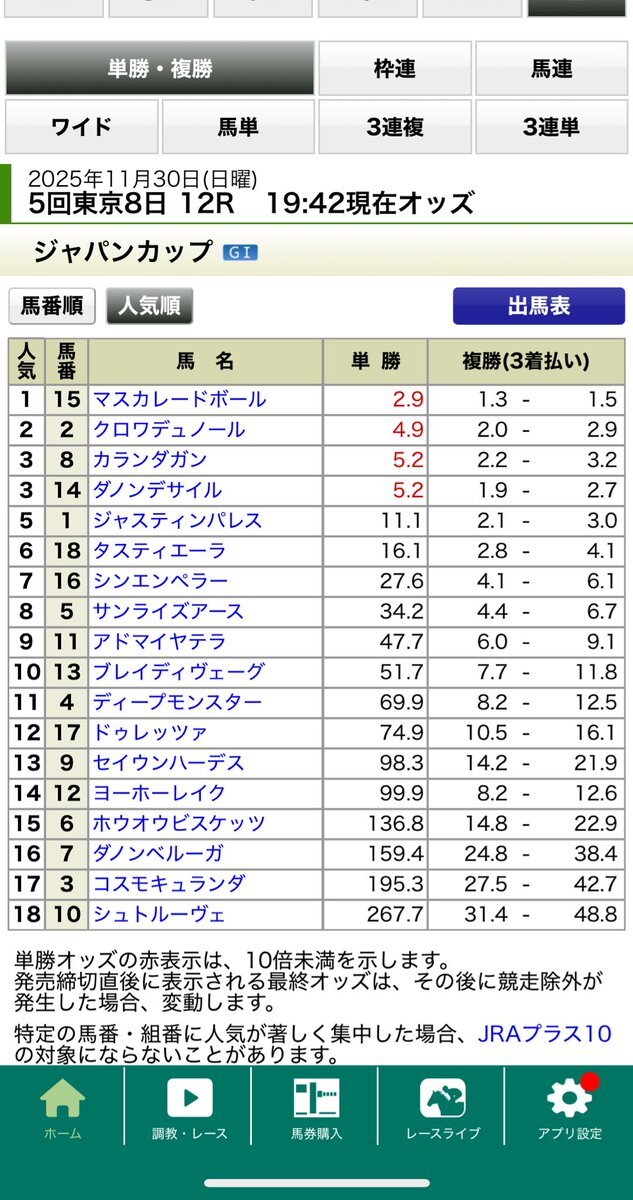 ジャパンC ジャパンCから有馬記念へ ファン投票中ですが、中間発表では 1.2.15番が該当します。 1番は有馬記念で引退?みたいな話し聞き間違えてなければですが。 1番人気はルメさんですが、3歳馬で精神面が🤔当日良いのか🤔東京コース走るが中山は1.2着なし。堀厩舎3頭出し、友道厩舎6枠2頭🤔分からん x.com/givemeupeve/st…