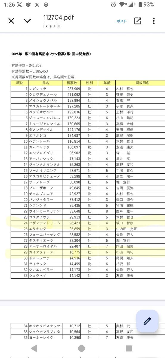 有馬記念ファン投票 第1回中間発表!気になる1位は? JRA jra.jp/news/202511/11… ダノンデサイルもうちょい上でもいいんじゃね?って思ったけど、最近日本でGⅠ取ってないからなのかな… シランケドは21位、アオラキくんは78位!!