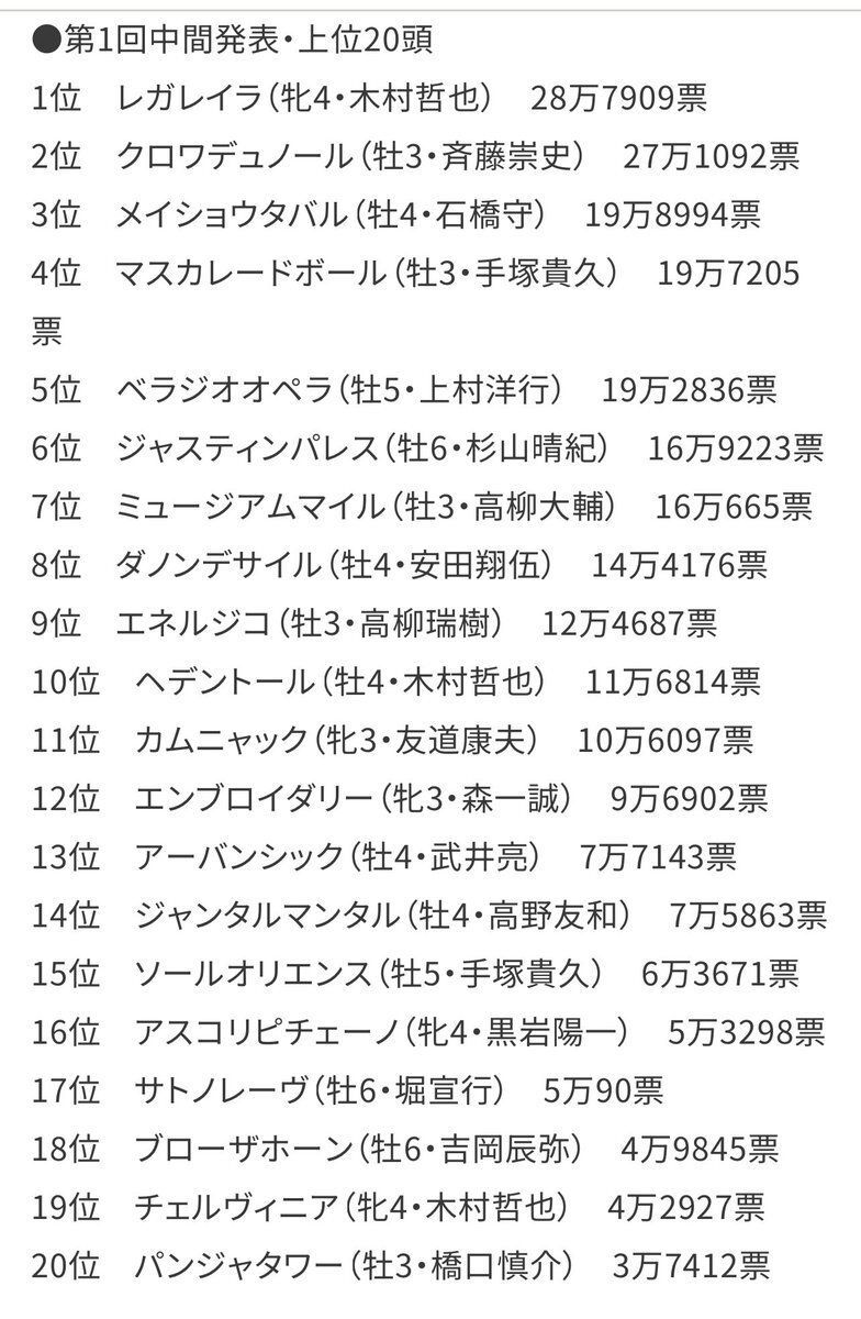 🐴有馬記念ファン投票 第1回中間発表‼️ 1⃣レガレイラ 牝4 2⃣クロワデュノール 牡3 3⃣メイショウタバル 牡4 4⃣マスカレードボール 牡3 5⃣ベラジオオペラ 牡5 6⃣ジャスティンパレス 牡6 7⃣ミュージアムマイル 牡3 8⃣ダノンデサイル 牡4 9⃣エネルジコ 牡3 🔟ヘデントール 牡4 pic.x.com/Zuv5uh1dCh