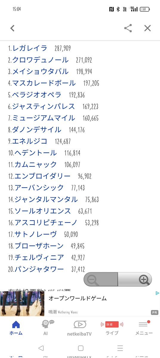 【有馬記念】ファン投票第1回中間発表!上位に選ばれたのは...? nannnosono.livedoor.blog/archives/29973… ※順位 馬名 票数 1 レガレイラ 287,909 2 クロワデュノール 271,092 3 メイショウタバル 198,994 4 マスカレードボール 197,205 5 ベラジオオペラ 192,836