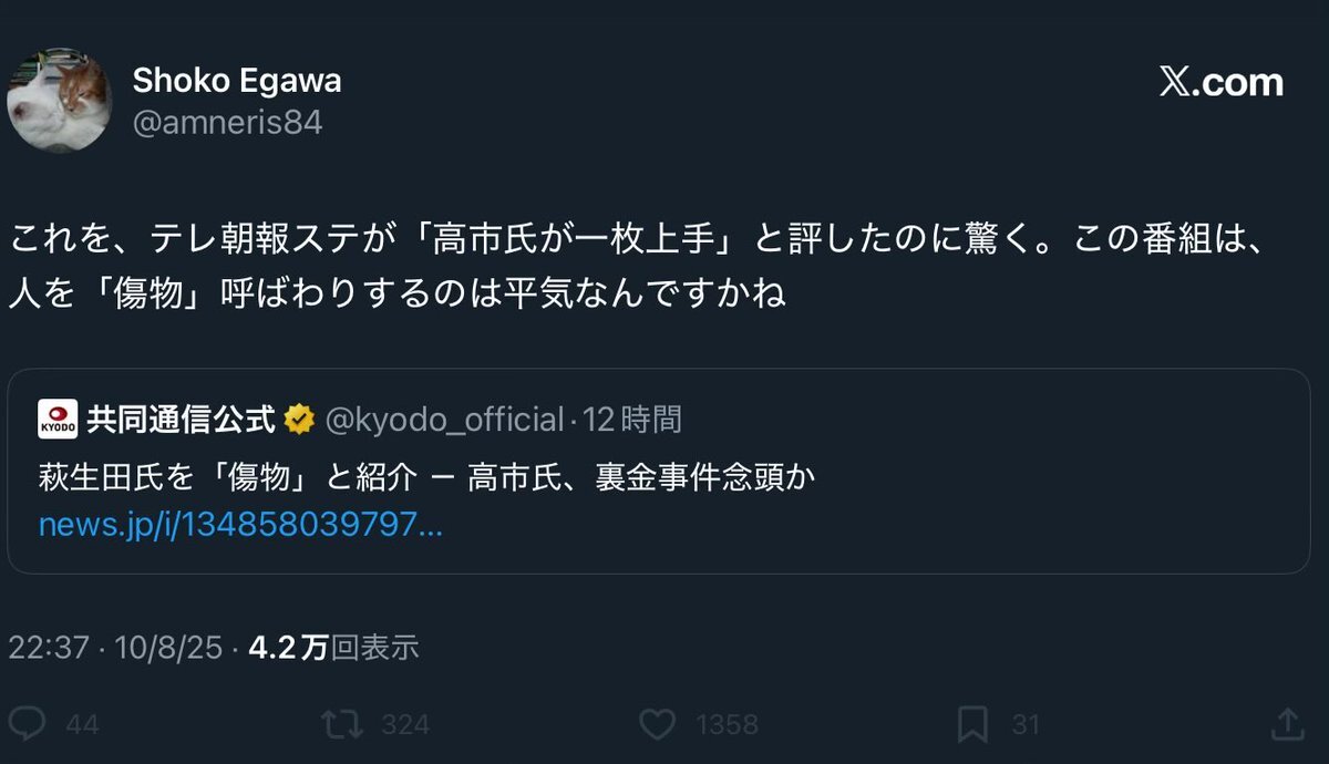 高市新総裁をかつて、口裂け女呼ばわりした「劣等民族」発現の青木理氏を、平気で復帰させた番組もあるんですから、いいんじゃないですか?