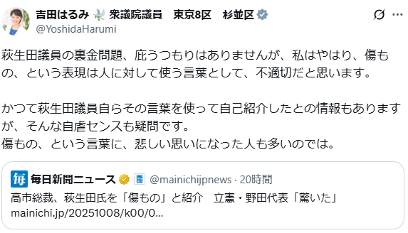 「傷物」を問題視するのなら、立憲本庄政調会長の「麻生家にお嫁入りした高市総裁」にも、さぞ江川紹子氏は問題視しているのでしょうね...。 x.com/mogura2001/sta…