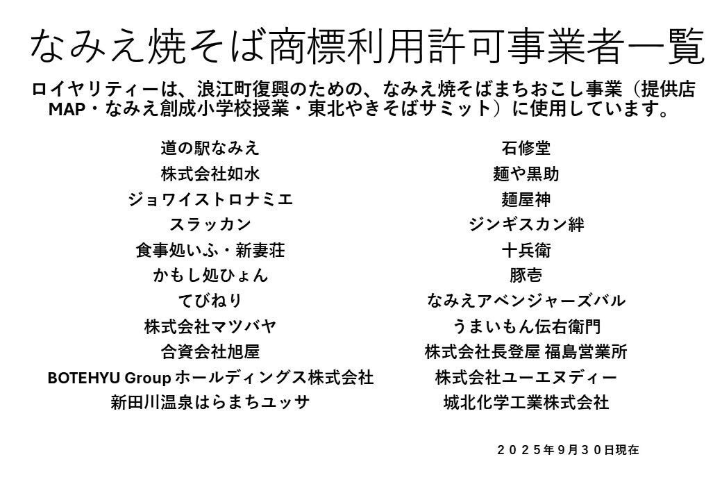 なみえ焼そばの商標利用について、弊社で浪江町商工会から委託を受けて、10月1日より管理いたします。下記の事業者について許可をしております。 商標管理サイト namieyakisoba.info #浪江町 #なみえ焼そば #地域団体商標 #まちおこし #浪江町商工会