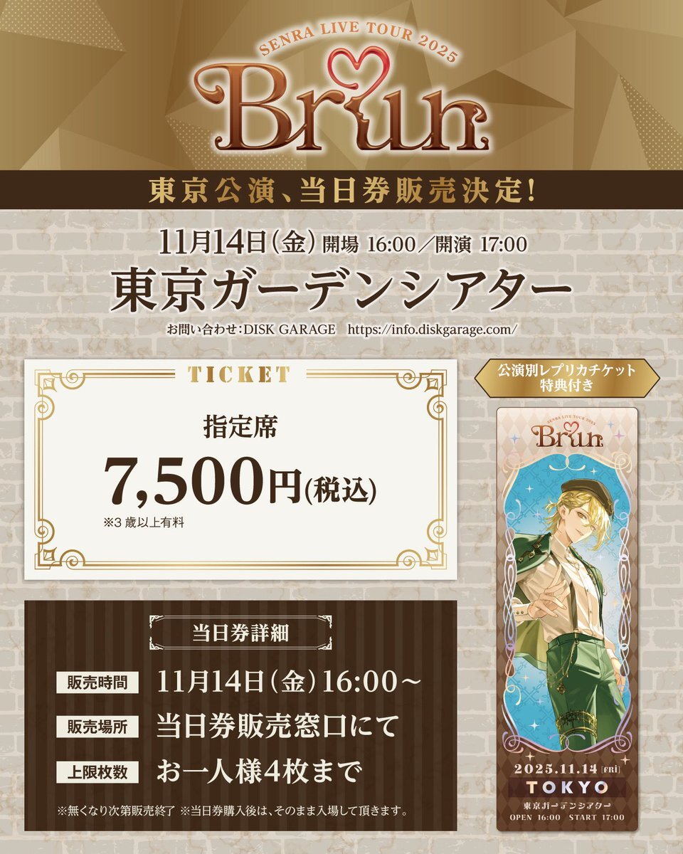 【センラワンマン東京公演当日券販売決定チョコ】 🍫SENRA LIVE TOUR 2025 -Brun-🍫 11/14(金)開場16:00/開演17:00 東京ガーデンシアター <当日券詳細> 販売時間:11/14(金)16:00~ 販売場所:当日券販売窓口にて 上限枚数:お一人様4枚まで pic.x.com/xHcIWTjZsA