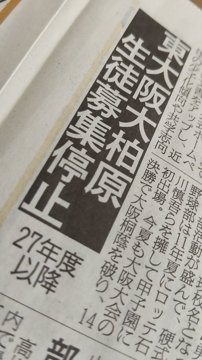 マジか。 今夏の甲子園に出場した私立男子校・東大阪大柏原高校が募集停止へ…少子化や共学志向で志願者が減少、法人が今秋決定 : 読売新聞オンライン yomiuri.co.jp/local/kansai/n…