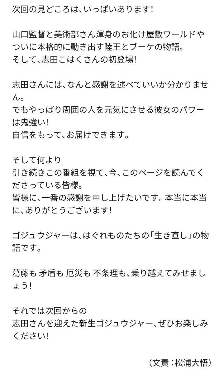 松浦Pからのメッセージ、涙無しでは読めなかった… 改めて、ゴジュウジャーのキャスト・スタッフ・関係者の皆様、ここしばらく大変な事が多々あったとは思いますが、楽しい番組を送り届けて下さり本当にありがとうございます。 最後まで楽しませていただきます! #ゴジュウジャー #ゴジュウジャーナル