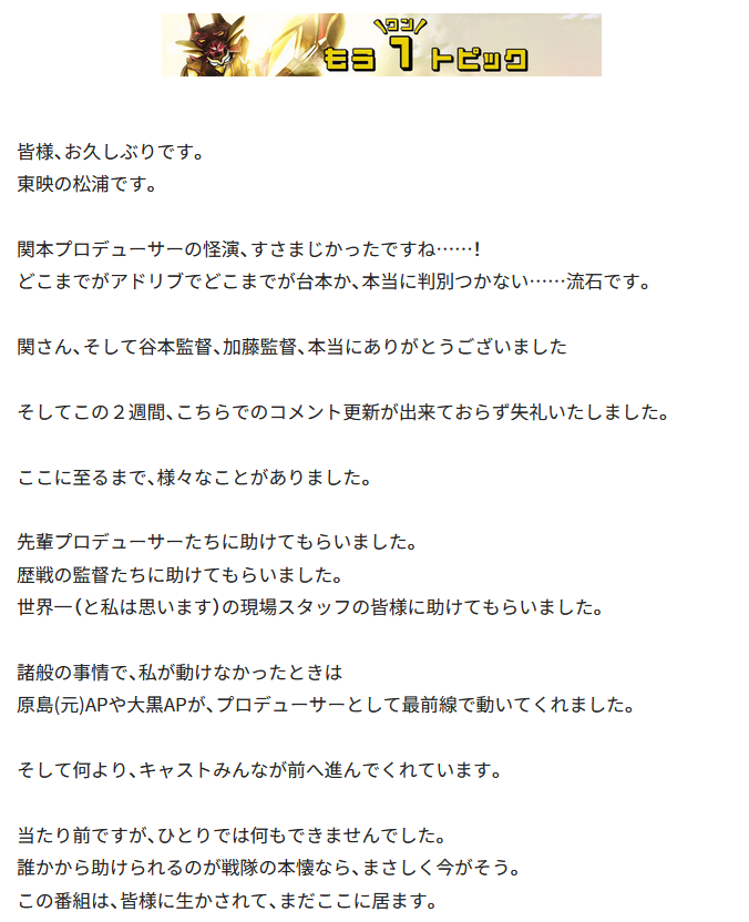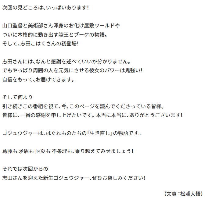 東映の関本カズPに大いに笑わせてもらった今回の『ゴジュウジャー』、番組放送後記の本家「東映」松浦Pのコメントも是非併せて読むべきですよ。 本物の「プロデューサー」の仕事に胸を打たれる、というか胃を貫かれる…… 大変、大変大変お疲れ様でしたッ!!!(最々々敬礼 toei.co.jp/entertainment/…