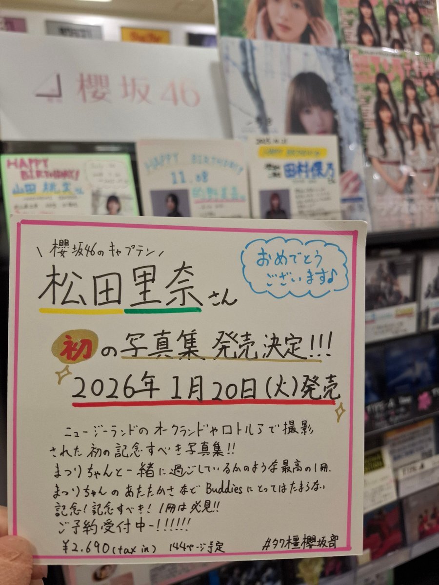 #松田里奈 / #櫻坂46】 / キャプテンのまつりちゃんの写真集が 2026年1月20日(火)に発売決定😭🙌 \ グループの活動以外にも朝の情報番組やバラエティー番組にも出演中‼️ 笑顔溢れる素敵な1冊に間違いなし⁉️ 商品のご予約はこちら 🔗tower.jp/item/7852975 #松田里奈1st写真集 #タワ橿櫻坂部 pic.x.com/RLpbPitBrv x.com/sakurazaka46/s…