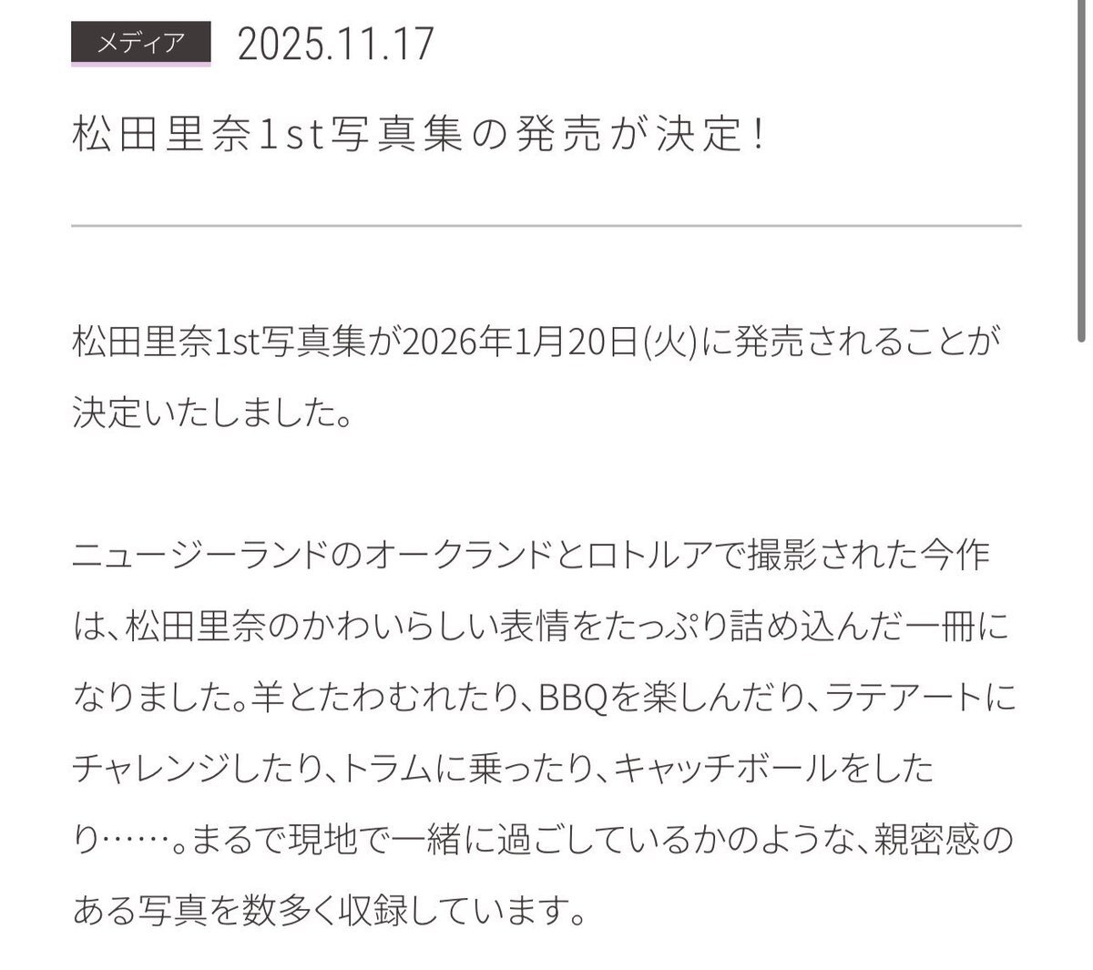 櫻坂46 松田里奈 1st写真集『タイトル未定』 単行本(ソフトカバー) – 2026/1/20 amzn.to/4nXQBXy amazon #ad 櫻坂46のキャプテン・松田里奈さんの1st写真集の発売が決定いたしました。 ニュージーランドのオークランドとロトルアで撮影 pic.x.com/skHG2yVfKC