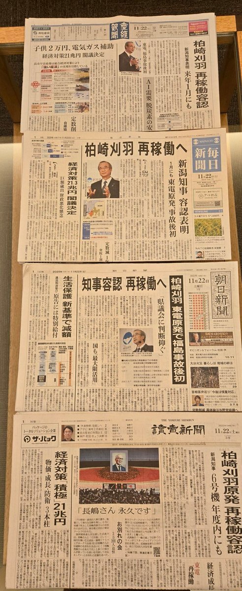 11月22日(土) #新聞一面メモ 読売『柏崎刈羽原発 再稼働容認 新潟知事 6号機 年度内にも』 毎日『柏崎刈羽 再稼働へ 新潟知事 容認表明 東電原発、事故後初 1月にも』 産経『柏崎刈羽 再稼働容認 新潟知事表明 来年1月にも』 東京『柏崎刈羽の再稼働容認 福島事故14年