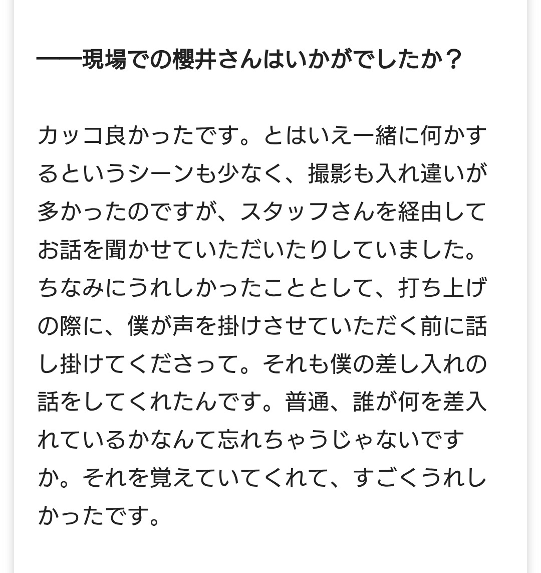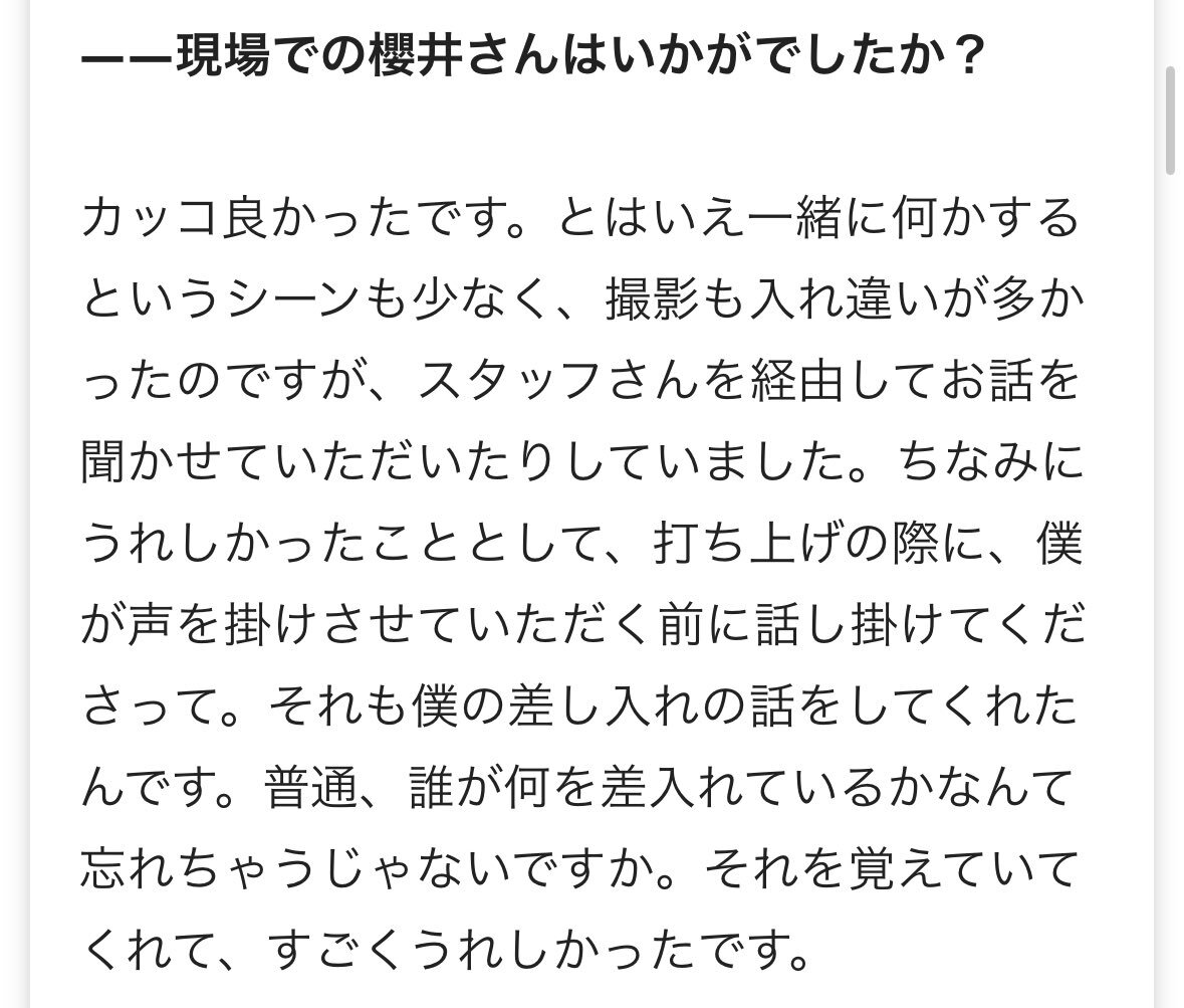 ◆ 現場での櫻井さんは 打ち上げの際に、僕が声を掛けさせていただく前に話し掛けてくださって。 それも僕の差し入れの話をしてくれたんです。 普通、誰が何を差入れているかなんて忘れちゃうじゃないですか。 それを覚えていてくれて、すごくうれしかったです。 #放送局占拠 #柏木悠 #櫻井翔 pic.x.com/WjSpPqoQIl