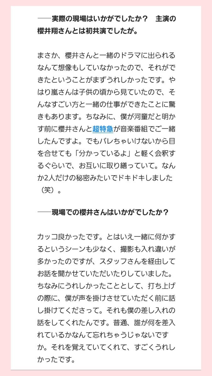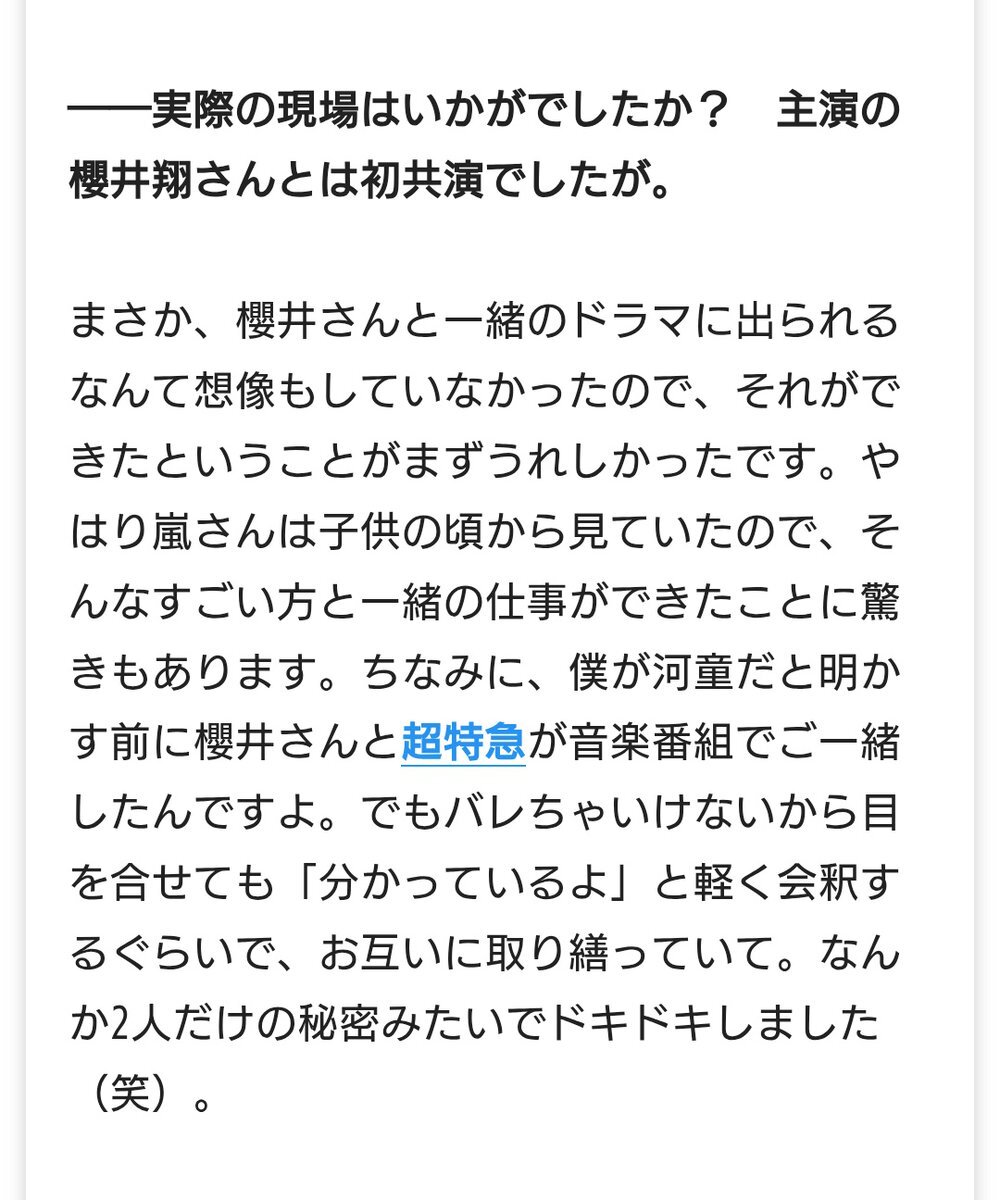 RP 柏木悠くんから聞けた放送局占拠と櫻井翔くんのお話が嬉しかった😊 打ち上げの話は翔くんらしいし😊櫻井さんと御一緒するのも1つの夢だったと言ってくださってて超嬉しかった💕また御一緒できると良いな☺️ news.yahoo.co.jp/articles/55611…