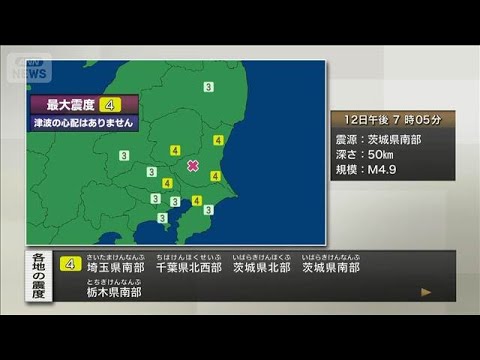 12日午後7時5分ごろ、茨城県南部を震源とする地震が発生し、震源の深さ約50キロ、マグニチュード4.9で関東地方を中心に揺れました。震度4を観測したのは茨城県北部・南部や栃木県南部、埼玉県南部、千葉県北西部などで、震度3は東京23区や神奈川県東部など広範囲に及びました。
