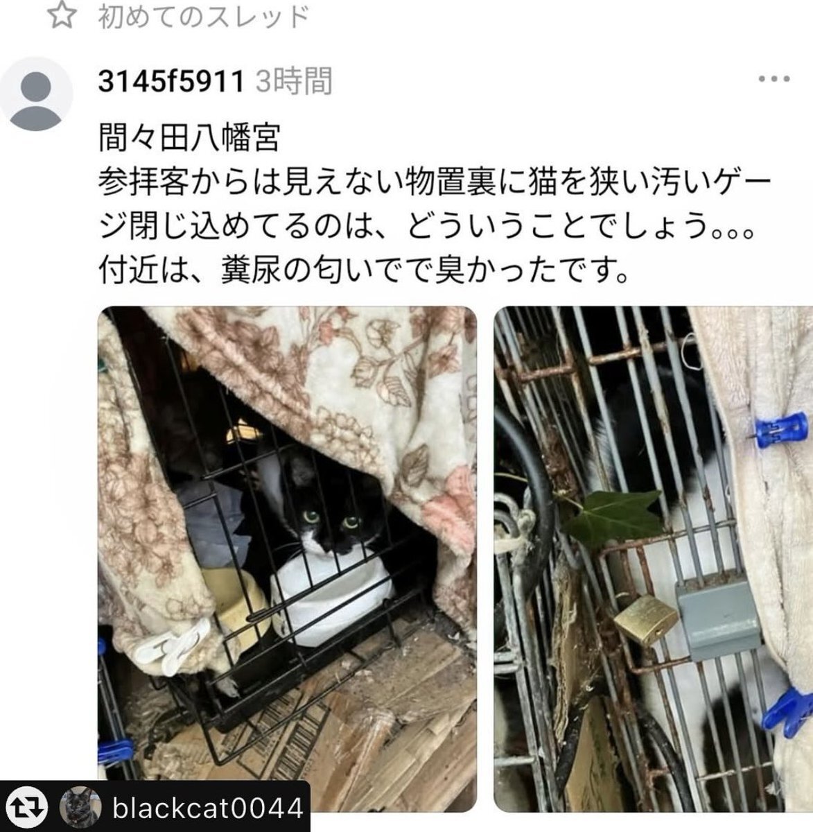スレッズより、栃木県小山市間々田八幡宮近くに住んでる方いませんか?猫達が劣悪な環境でケージいれられてるそうです。元投稿のスレッド主は投稿消してもうないそうなんですが近くの方確認してあげてくれませんか❓🙏 #栃木県 #小山市 #動物虐待 #拡散希望 pic.x.com/tJ7y3jqBJu