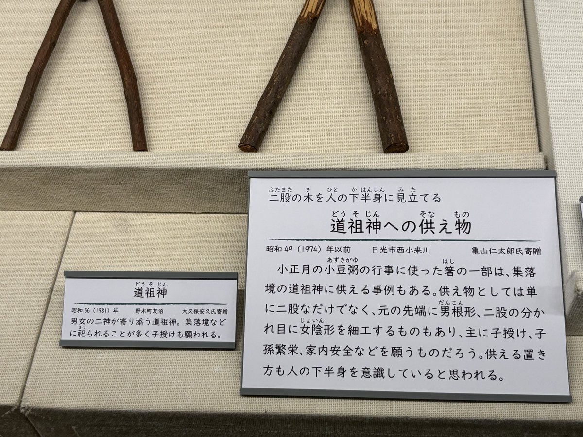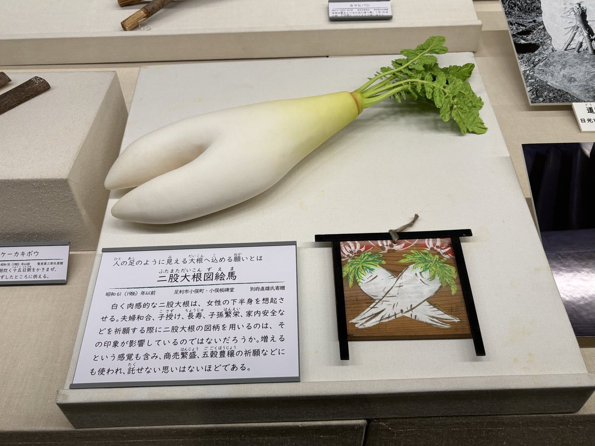 栃木県立博物館の企画展「“異”常の色・形~時に思いが宿るもの~」へ。これは行って良かった。特別な形や色が信仰や行事で使われる様々な物を展示しており、非常に多様で広範な民俗文化の例が見られる。山梨岡神社の夔ノ神も珍しいが二股大根が良かった。二股大根の前立ての兜まであった。 pic.x.com/T7HtOKcMn3