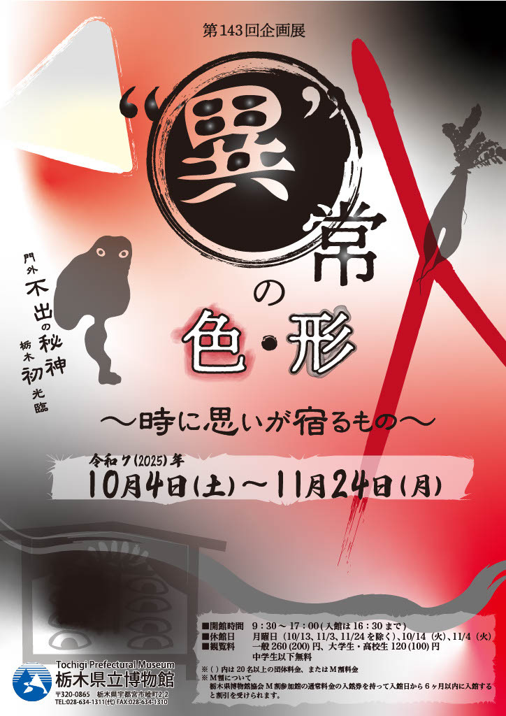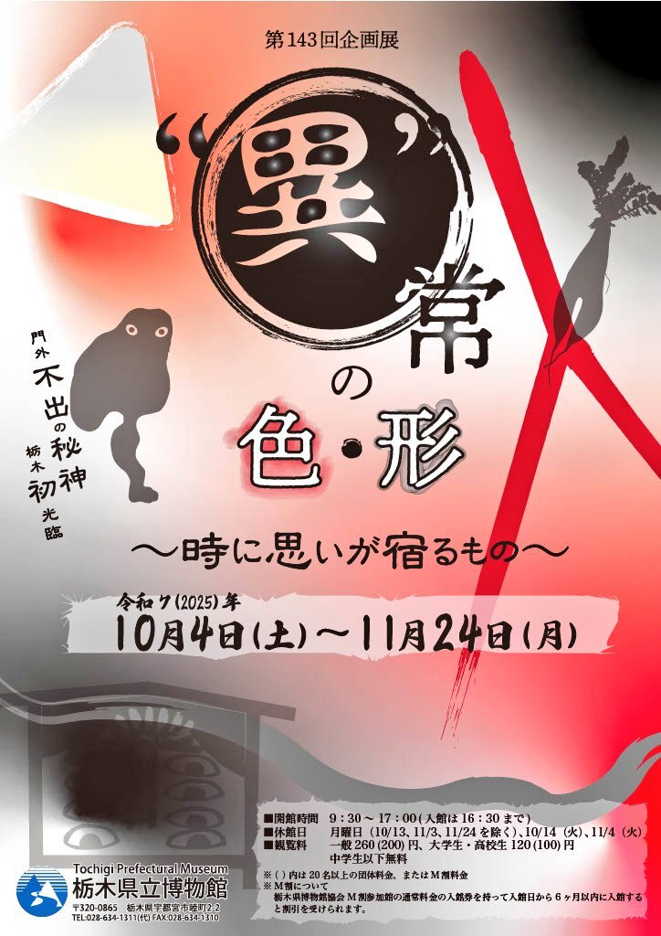/ #栃木県立博物館 企画展 「“異”常の色・形 ~時に思いが宿るもの~」👻 \ 特別な時に多用される色や形に関する民俗事例を通して、私たちの思いや考え方を読み取ろうとする展示です🧐 ぜひお越しください。 ✅会期:10/4(土)~11/24(月・振休) muse.pref.tochigi.lg.jp #栃木県 #栃木県情報 pic.x.com/zw0VEZVRXb