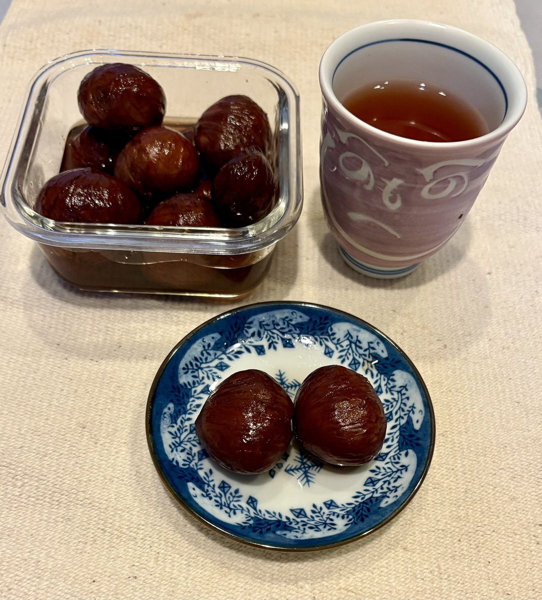 1日貯まってた台所仕事などしてた。 栗の渋皮煮1.6キロせっせと仕込んで 茹で栗は冷凍して、崩れた栗は栗あんにして 貯まってた瓶も煮沸消毒できたし 十三夜のお月見団子と黒豆も作ってお供えしたし、晩ご飯も作ったので偉い👏