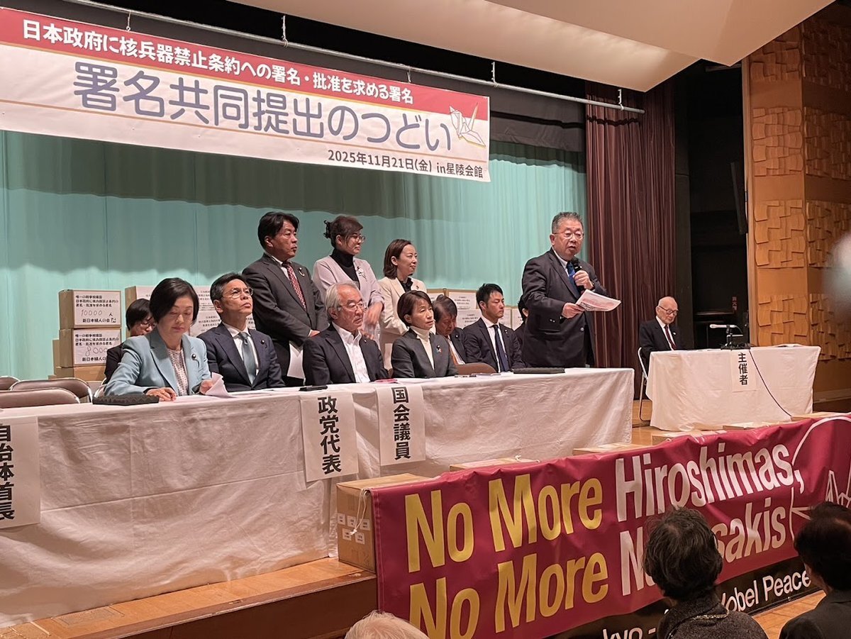 今日は、核兵器禁止条約の署名・批准を求める署名提出集会。344万9012名分の署名が積み上げられました。私は「今年7月に被爆80年にあたって発表されたアピール、そして今回の署名提出行動と、核兵器廃絶運動をすすめてきた被団協・原水協・原水禁の三者が共同して運動を展開されていることは、画期的、 pic.x.com/QXCv5sppHm