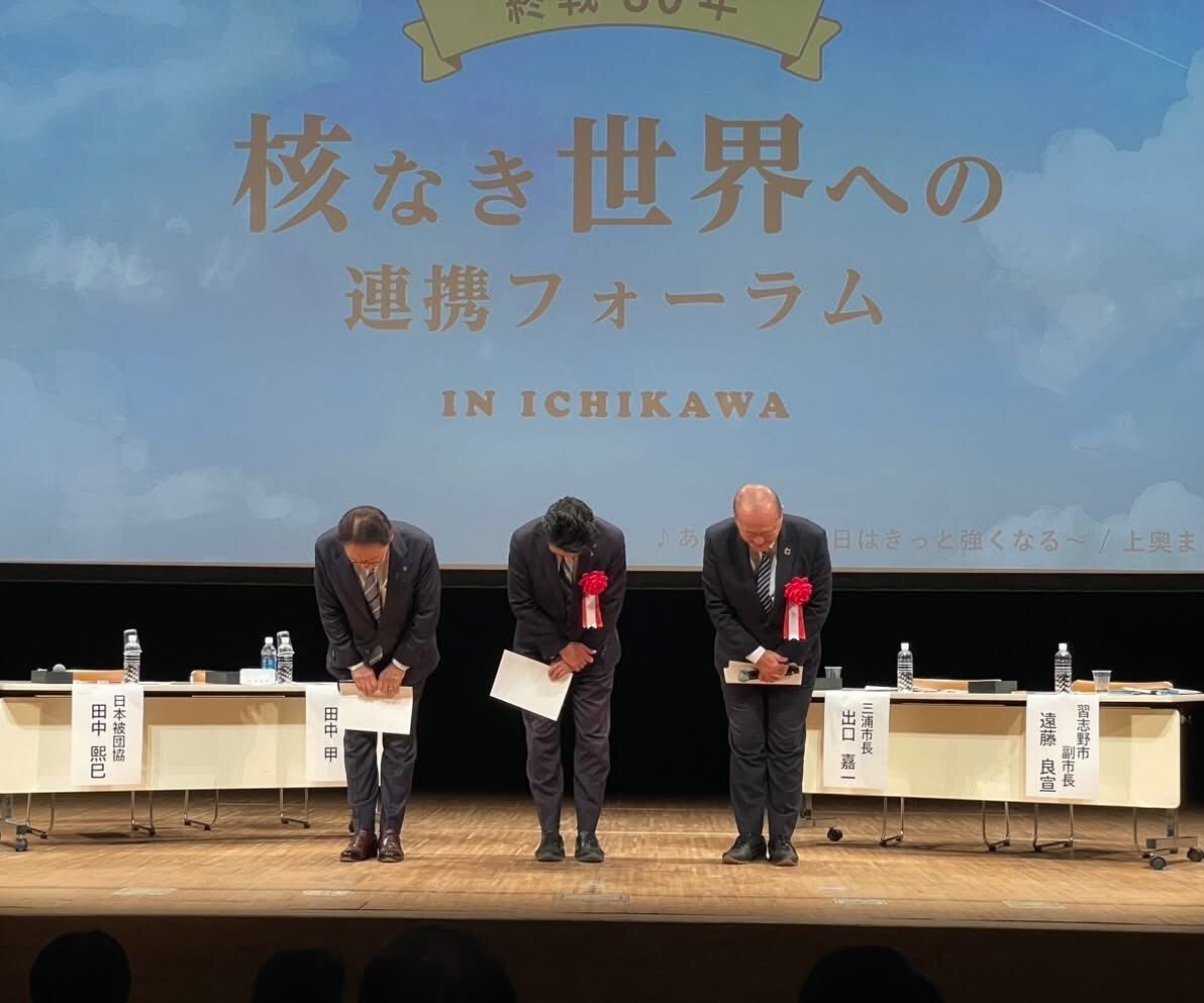 核なき世界への連携フォーラムinいちかわ 広島・長崎両市長からビデオメッセージをいただき三浦市市長・習志野市副市長はじめ6市の協力をいただき、関東地方で核兵器廃絶平和都市宣言の大会を開くことができました。 pic.x.com/0S0E6mxa9V