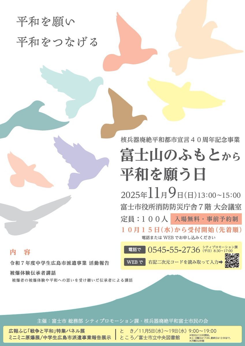 【富士山のふもとから平和を願う日】 今年は、核兵器廃絶平和都市宣言から40周年という節目の年です。 この機会に平和について考えてみませんか。 とき/11月9日(日)13時~15時 ところ/消防防災庁舎7階大会議室 内容/被爆体験伝承者講話 ※要事前申込・先着順。 city.fuji.shizuoka.jp/shiseijoho/hei… #富士市 pic.x.com/Pnovx9OSwM