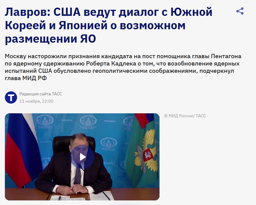 ラブロフ:米国は韓国と日本と核兵器配備の可能性について対話中 ロシア外相は、ペンタゴン核抑止担当次官候補のロバート・カドレック氏が、米国の核実験再開は地政学的配慮によるものだと認めたことに、モスクワが警戒感を示していると強調した。 tass.ru/politika/25592…