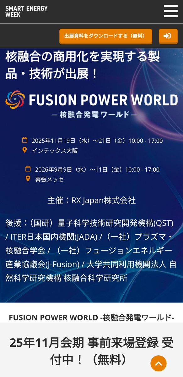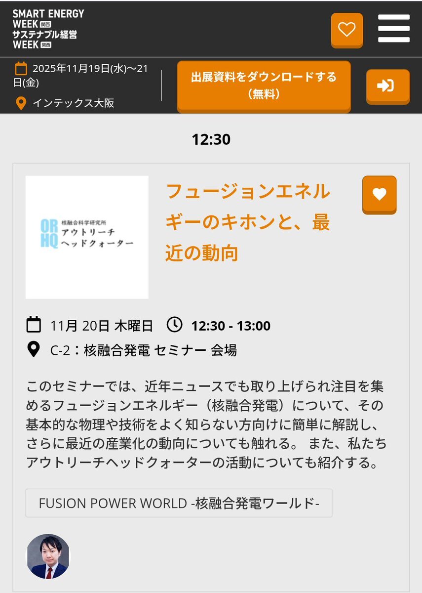 開催まで2週間を切りました! ⚛️FUSION POWER WORLD @インテックス大阪 11/19(水)〜21(金) 今回、私は核融合科学研究所のなかでも新設チーム 「アウトリーチヘッドクォーター」 の一員として参加 セミナーにも登壇します 是非起こし下さい! 📃資料取得も可⬇️ wsew.jp/osaka/ja-jp/se… pic.x.com/36coT2miVn