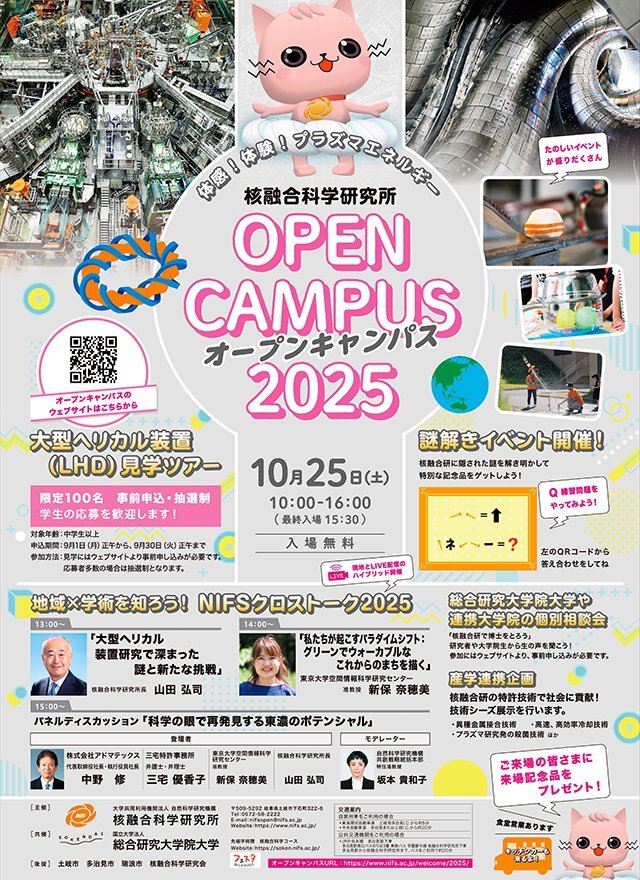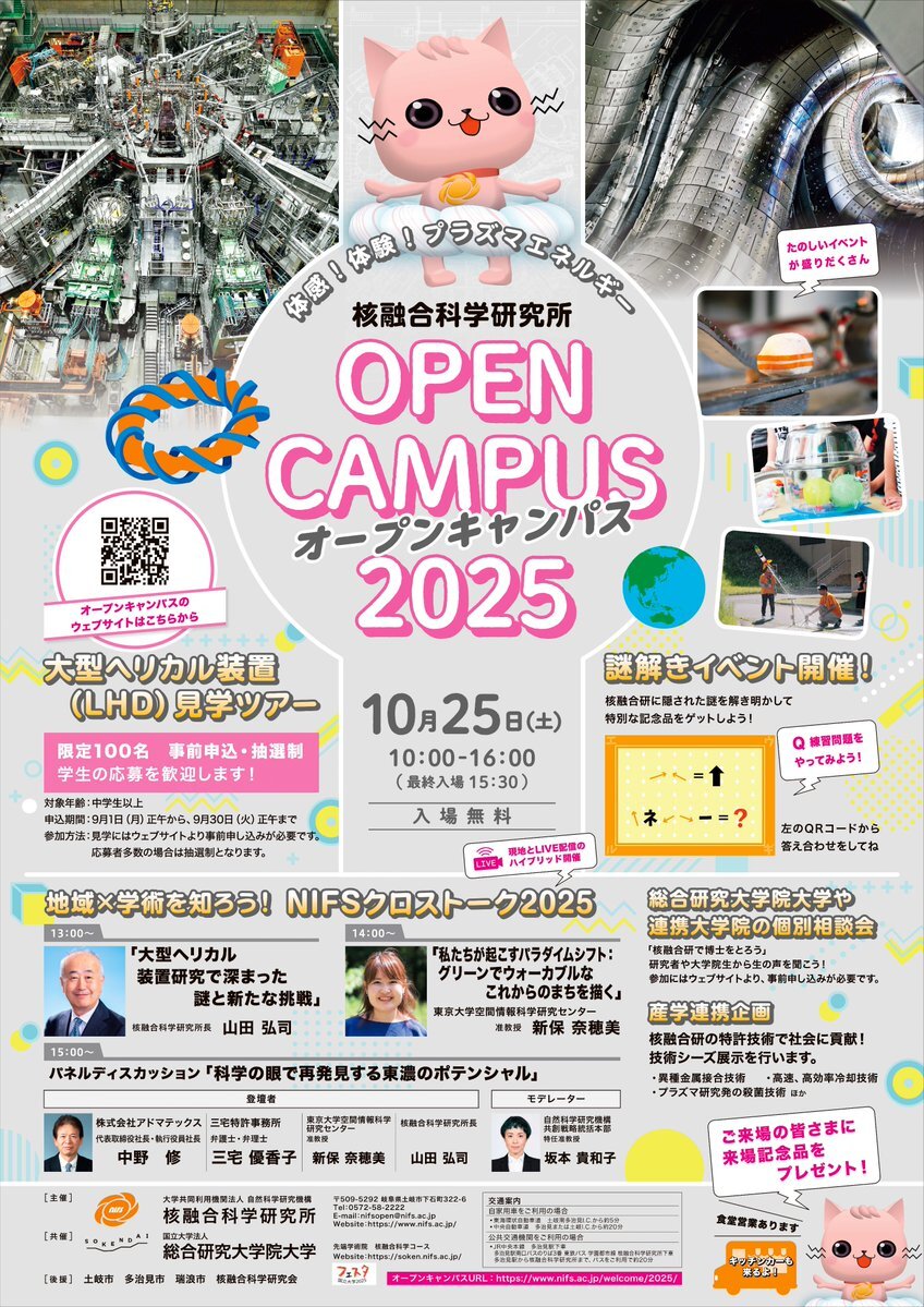 【オープンキャンパス10/25】明日、AM10:00から開催!研究施設(世界最大級の超伝導プラズマ閉じ込め実験装置、スーパーコンピュータ、ヘリウム液化冷凍機室など)を公開!NIFSクロストーク2025、科学実験、工作教室など。お待ちしております。 #核融合 #一般公開 #明日10時 nifs.ac.jp/welcome/2025/