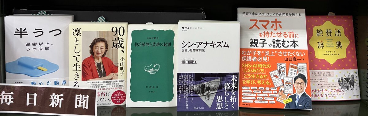 本日の毎日新聞書評です。 「半うつ 憂鬱以上うつ未満」 「90歳.凛として生きる」 「栽培植物と農耕の起源」 「シン•アナキズム」 「スマホを持たせる前に親子で読む本」 「絶賛語辞典」 など在庫ございます。 pic.x.com/DtWtBjRM6k