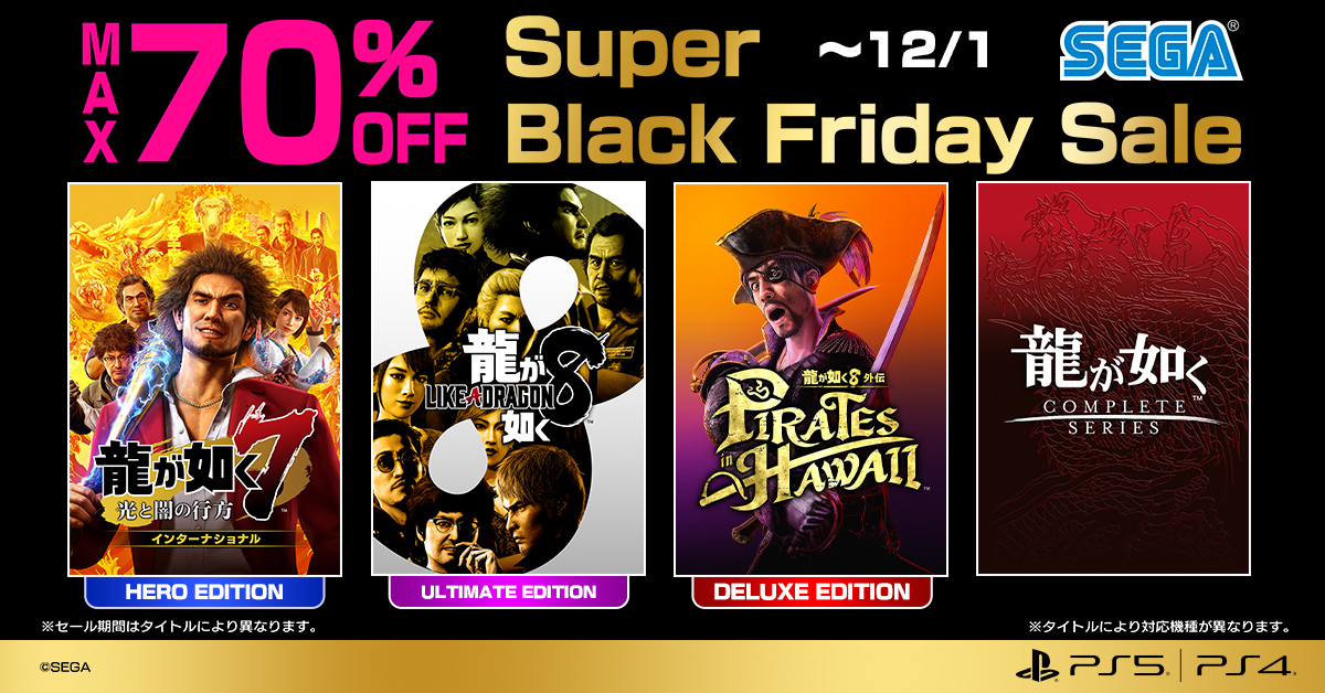 ◤◢◤◢◤◢◤◢◤◢◤◢◤◢◤◢ SEGA Super Black Friday Sale 12月1日(月)まで開催中🎉🎉 ◤◢◤◢◤◢◤◢◤◢◤◢◤◢◤◢ まだ『#龍が如く』シリーズをプレイしたことがない方は必見‼ PS4やPS5でお得に遊べるチャンス✨ 詳細はこちらをチェック▼ sega.jp/special/sale/