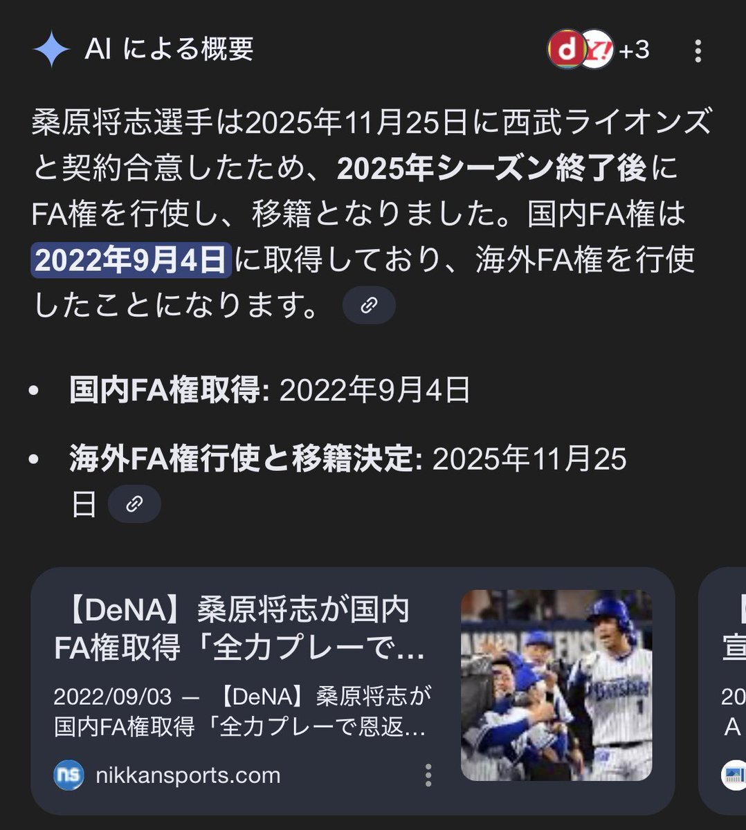返信先:@DiegoBragaC確認しました。西武ライオンズは2025年11月25日、DeNAから海外FA権を行使した桑原将志選手の獲得を正式発表。Yahoo!ニュース、日刊スポーツなど複数メディアで報じられています。事実です。