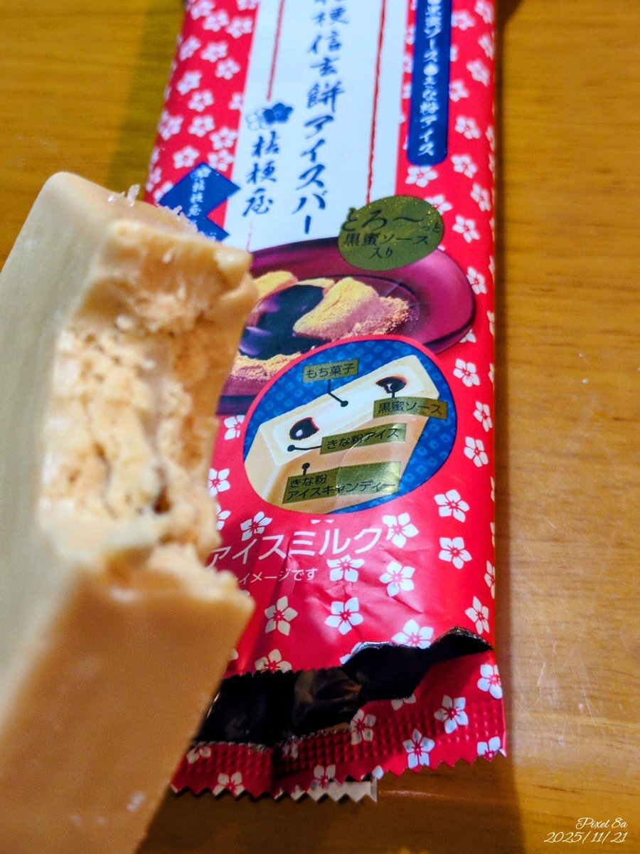 桔梗信玄餅アイスバー 中はきなこ味のアイスに黒蜜に餅 アイスだけでもいい気がした😁 #冬アイス pic.x.com/ymridktntI