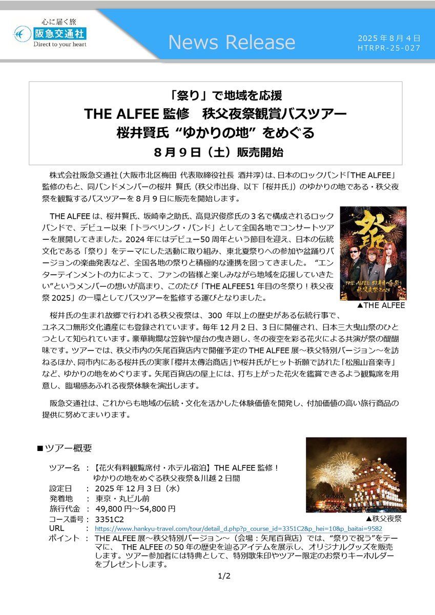 【🆕ニュースリリース】 THE ALFEE 監修✨ 桜井賢氏のゆかりの地である・秩父夜祭を観覧するバスツアーを8月9日に販売🚌 桜井氏の実家「櫻井太伝治商店」をはじめ、桜井氏がヒット祈願に訪れた音楽寺、THE ALFEE展(秩父特別バージョン)などを巡ります! 予約はこちら👇 hankyu-travel.com/tour/search_d.… pic.x.com/KdNEHPXQw1