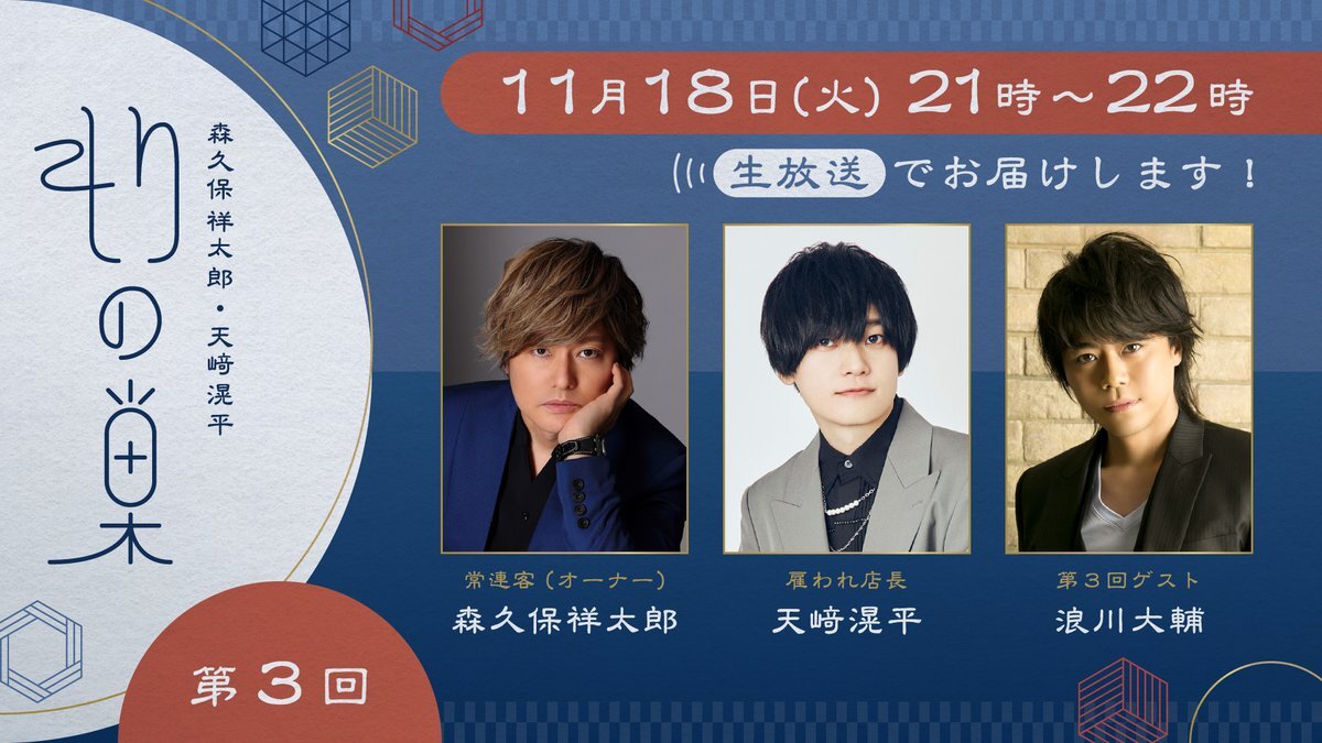 🍺森久保祥太郎・天﨑滉平「もりの巣」#3 🍺 11/18(火)の生配信は かつてのBarから常連である 浪川大輔様がゲストでご出演!👏 これは見逃せない…! 是非チャンネル登録してお待ちください🎥 youtube.com/live/Qc2rQR8ga… #もりのす pic.x.com/5t3VkfduB6