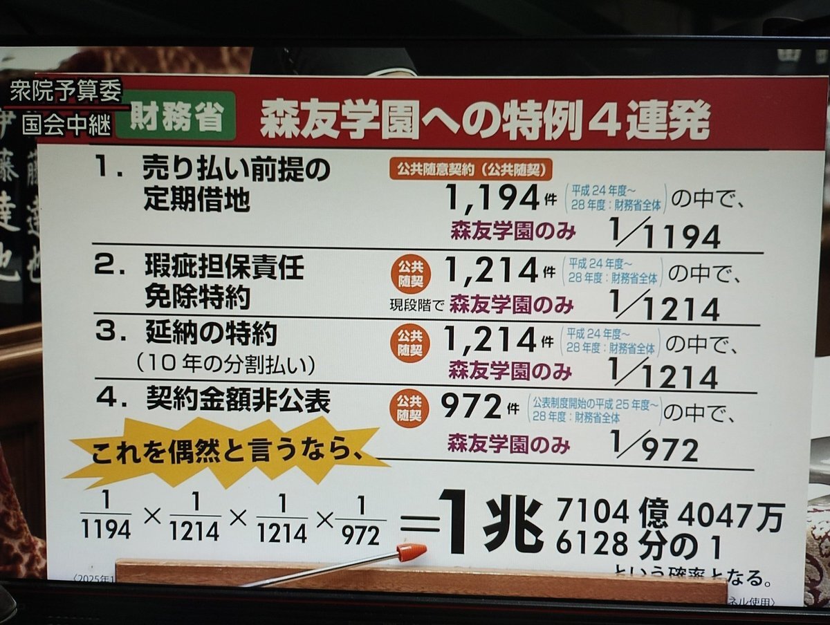 みんな驚かずに聴いてほしい 今日の予算委員会で質問された『森友学園問題』 なんと財務省は森友学園に宝くじの一等が8万回当たるほどの確率での前例なき特例を行っていた! この日は赤木雅子さんも傍聴 これほどまでに政治の私物化をしていた安倍晋三を許してはならない!! pic.x.com/LYN1Y4psXT x.com/zuboc/status/1…