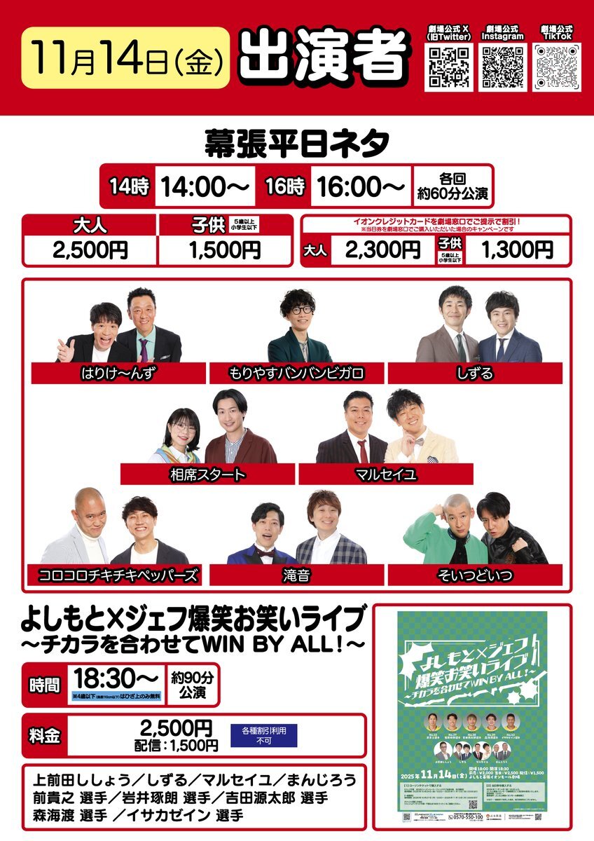 ˗ˏˋ💜1000円引きクーポン配布中!💜 ˎˊ˗ 【本日チケットあります🙆‍♀️】 🌟幕張平日ネタ ①14:00~ ②16:00~ 出演:はりけ~んず/もりやすバンバンビガロ/しずる/相席スタート/マルセイユ/コロコロチキチキペッパーズ/滝音/そいつどいつ 🌟18:30~ よしもと×ジェフ爆笑お笑いライブ