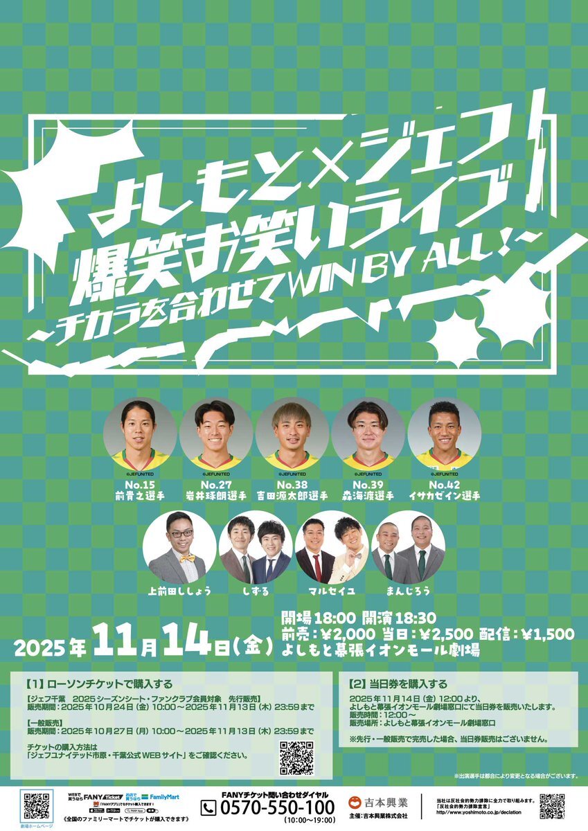 / 11/14よしもとコラボ公演 チケット好評発売中📢 \ 試合のない週末は #よしもと幕張 でジェフ活!🟡🟢🔴 初出しプライベート写真や㊙トークがもりだくさん✨ ご参戦お待ちしております🐶 ⏬出演予定⏬ ⚽ #jefunited 前貴之 選手 岩井琢朗 選手 吉田源太郎 選手 森海渡 選手 イサカゼイン 選手 pic.x.com/NkE7P6DrBd