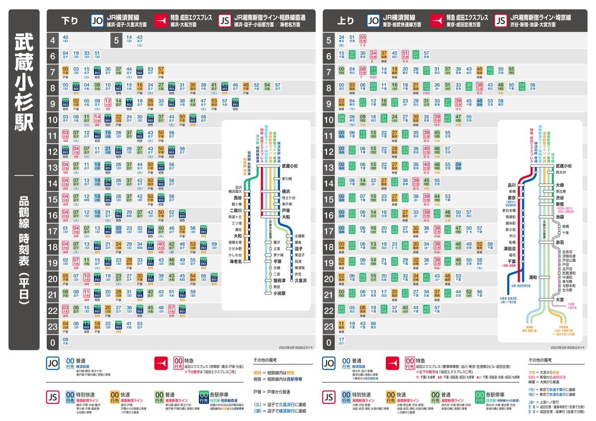 【カオス時刻表リクエスト第2弾】新宿駅に続いて、JR武蔵小杉駅 品鶴線(横須賀線 / 湘南新宿ライン / 埼京線・相鉄線直通)のダイヤをA4サイズ1枚に詰め込みました。 pic.x.com/jbBk4uXknc