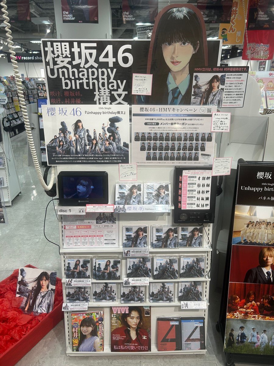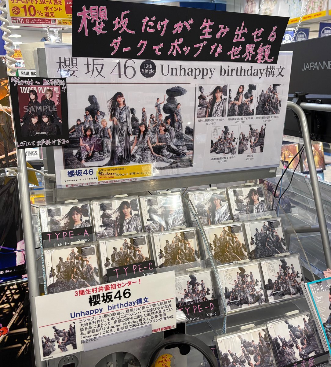 【#櫻坂46】 13th Single 『Unhappy birthday構文』 大好評発売中❕❕🎂 勢いに乗り続けた2025年の集大成ともなる 13枚目シングル🖤 4Fにてパネルも展示中です🎵 (酒屋) #櫻坂46_UnhappyBD構文 pic.x.com/QwwHotRyjw