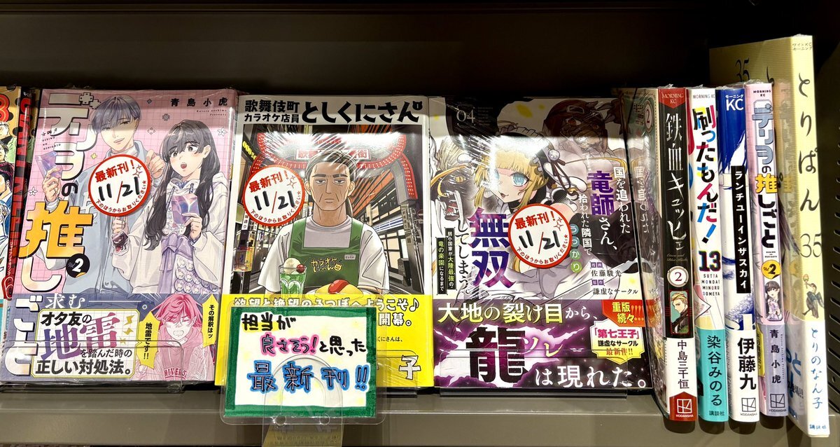 11/21本日入荷の新刊コミックです🌰 🆕#歌舞伎町カラオケ店員としくにさん🎤 🆕#新月の盤に☖ #イクサガミ #織田ちゃんと明智くん🏫 #国を追われた竜師さん拾われた隣国でうっかり無双してしまう。🦕 #GIANTKILLING⚽️ #昭和のグラゼニ⚾️ ⏬つづく⏬ #ネットカフェ #自遊空間 #新橋 #新刊情報 pic.x.com/qPqQ4ElqKk
