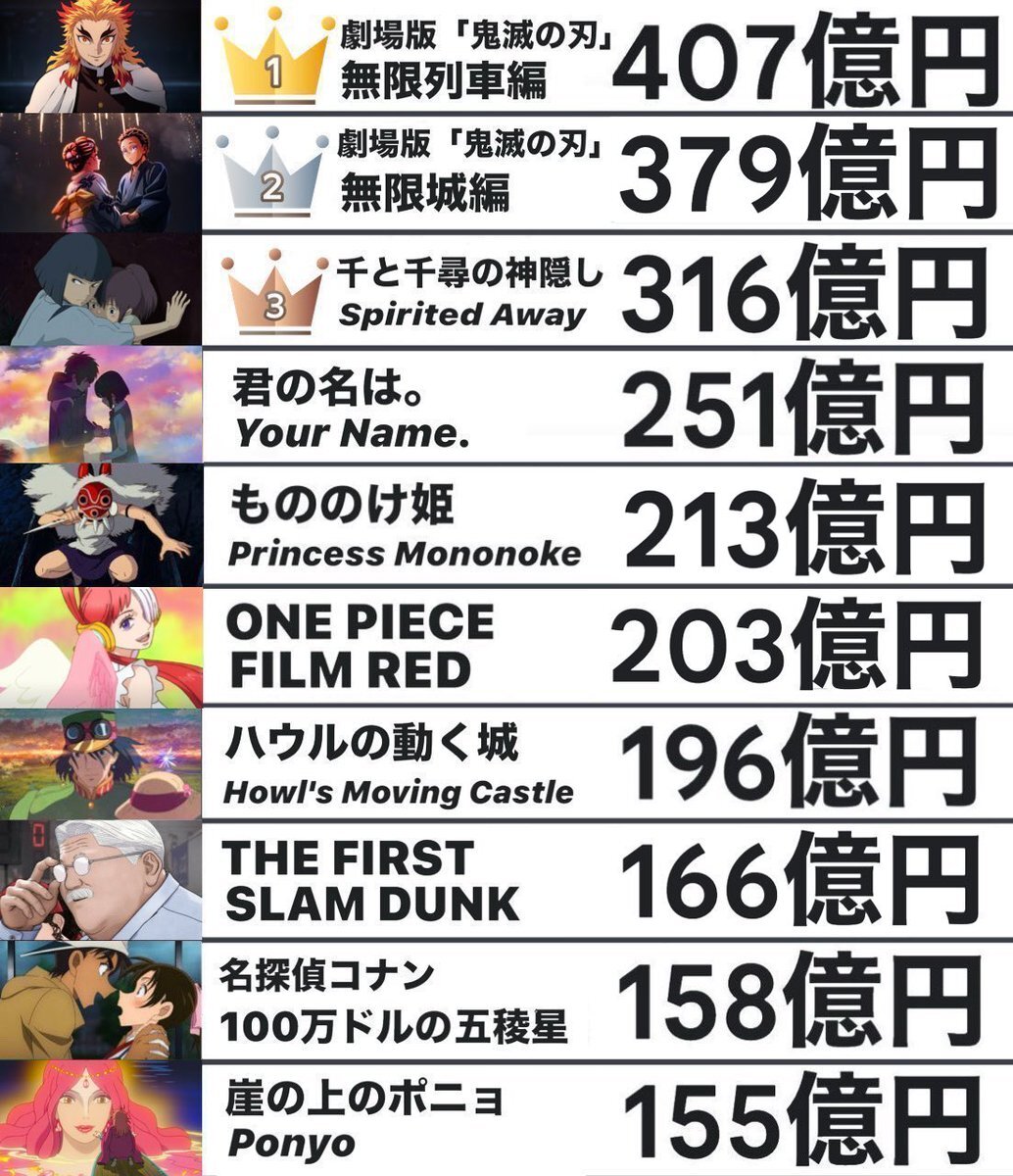 日本アニメの歴代興行収入ランキング 1️⃣鬼滅の刃 無限列車編 2️⃣鬼滅の刃 無限城編 第一章←🆕 3️⃣千と千尋の神隠し 4️⃣君の名は。 5️⃣もののけ姫←🆕 6️⃣ONE PIECE FILM RED 7️⃣ハウルの動く城 8️⃣THE FIRST SLAM DUNK 9️⃣名探偵コナン 100万ドルの五稜星 🔟崖の上のポニョ pic.x.com/NmXjyA3iIm