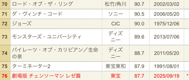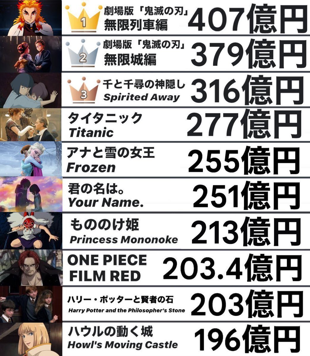 日本歴代興行収入ランキング(総合) 1️⃣鬼滅の刃 無限列車編 2️⃣鬼滅の刃 無限城編 第一章←🆕 3️⃣千と千尋の神隠し 4️⃣タイタニック 5️⃣アナと雪の女王 6️⃣君の名は。 7️⃣もののけ姫←🆕 8️⃣ONE PIECE FILM RED 9️⃣ハリーポッターと賢者の石 🔟ハウルの動く城 pic.x.com/qKMv0wxNov