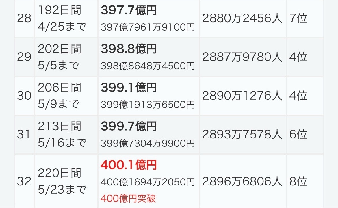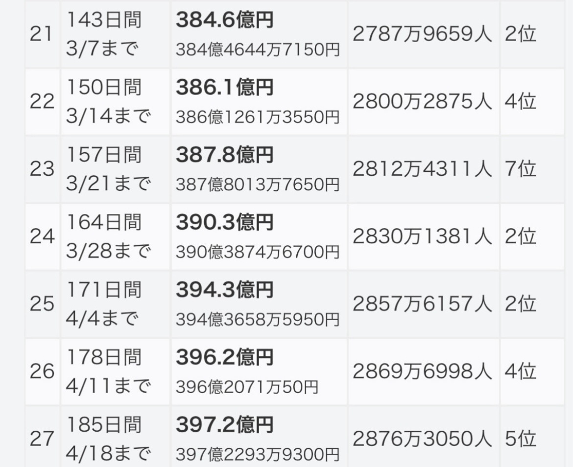 返信先:@mtt_75058鬼滅の刃無限城編猗窩座再来 上映開始日から今だにあの歴代興行収入1位の無限列車編を超える興行収入推移を維持しており最速ペースで380億突破✨ 400億まで遂に10億台に突入‼️‼️‼️ 来月冬休みブーストや紅白出場ブーストで390億まで伸びたら400億まであと10億になる😆🙌🎊🎊🎊 歴代1位は近い‼️