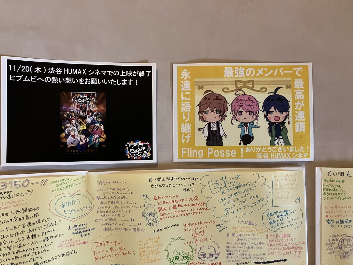 ㊗️渋谷HUMAXシネマ 歴代興行収入1位👑 「ヒプノシスマイク -Division Rap Battle-」 本日で上映はいったん終了しますが、メッセージボード、パネルなどの展示、関連グッズ販売は、11/24(月・祝)まで行います🎶 是非、ご来場ください🎶 #FlingPosse #ヒプムビ