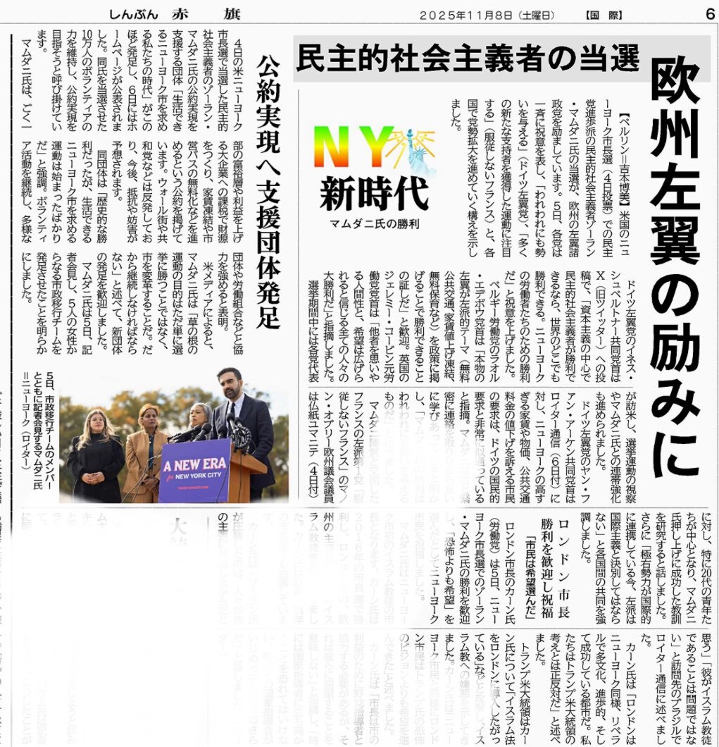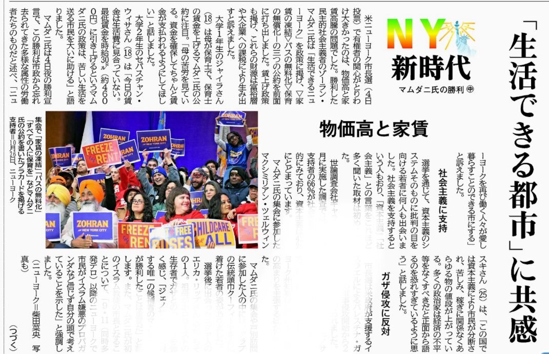 #マムダニ勝利の世界化 #NY新時代 #赤旗特集 新自由主義の破綻を背景に極右排外主義が、世界中で害悪を広げる中で、格差を無くして共生と人権を大切にする流れが各地で力を増している。マムダニ氏の勝利はその一つの現れであり、その流れに勢いを与える、そういう意味で歴史的勝利だと思う❣️ pic.x.com/4B3lQjT0Ky