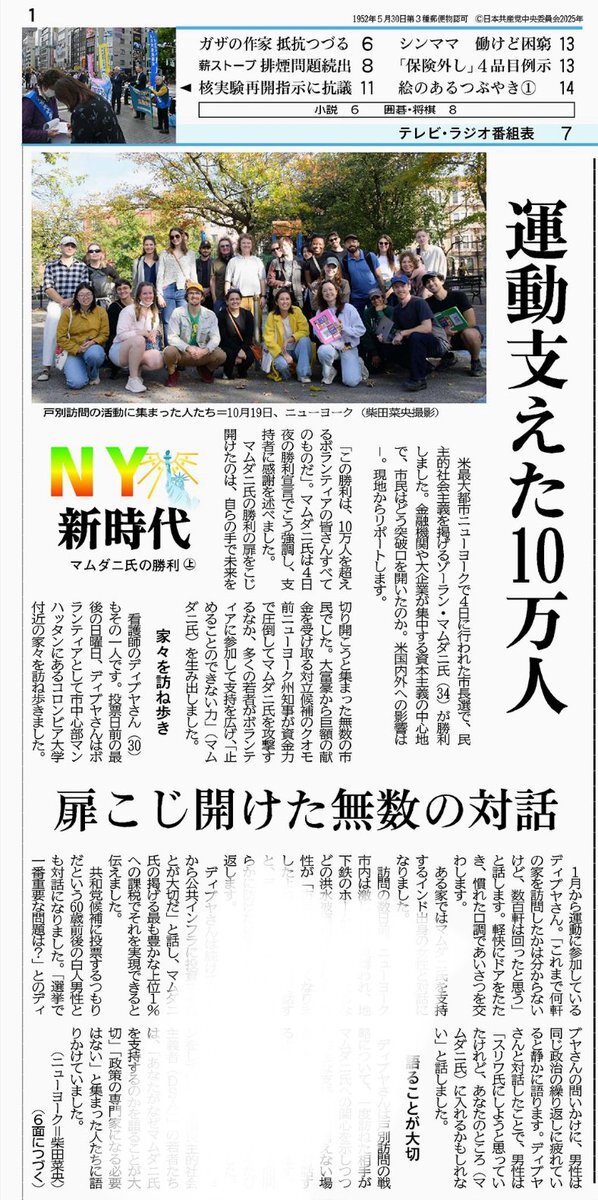 #ニューヨーク市長選 #新時代の米国への希望 #赤旗 世界中に衝撃を与えたマムダニ氏の戦い。支持率1%だった無名の新人の、歴史的勝利の秘密を探る連載が「赤旗」で始まる。第1回は「運動を支えた10万人」。市民が自分ごととして参加し、対話し、市民がこじ開けた勝利‼️ pic.x.com/IIdY2eBqF3 x.com/audrey_biralo/…