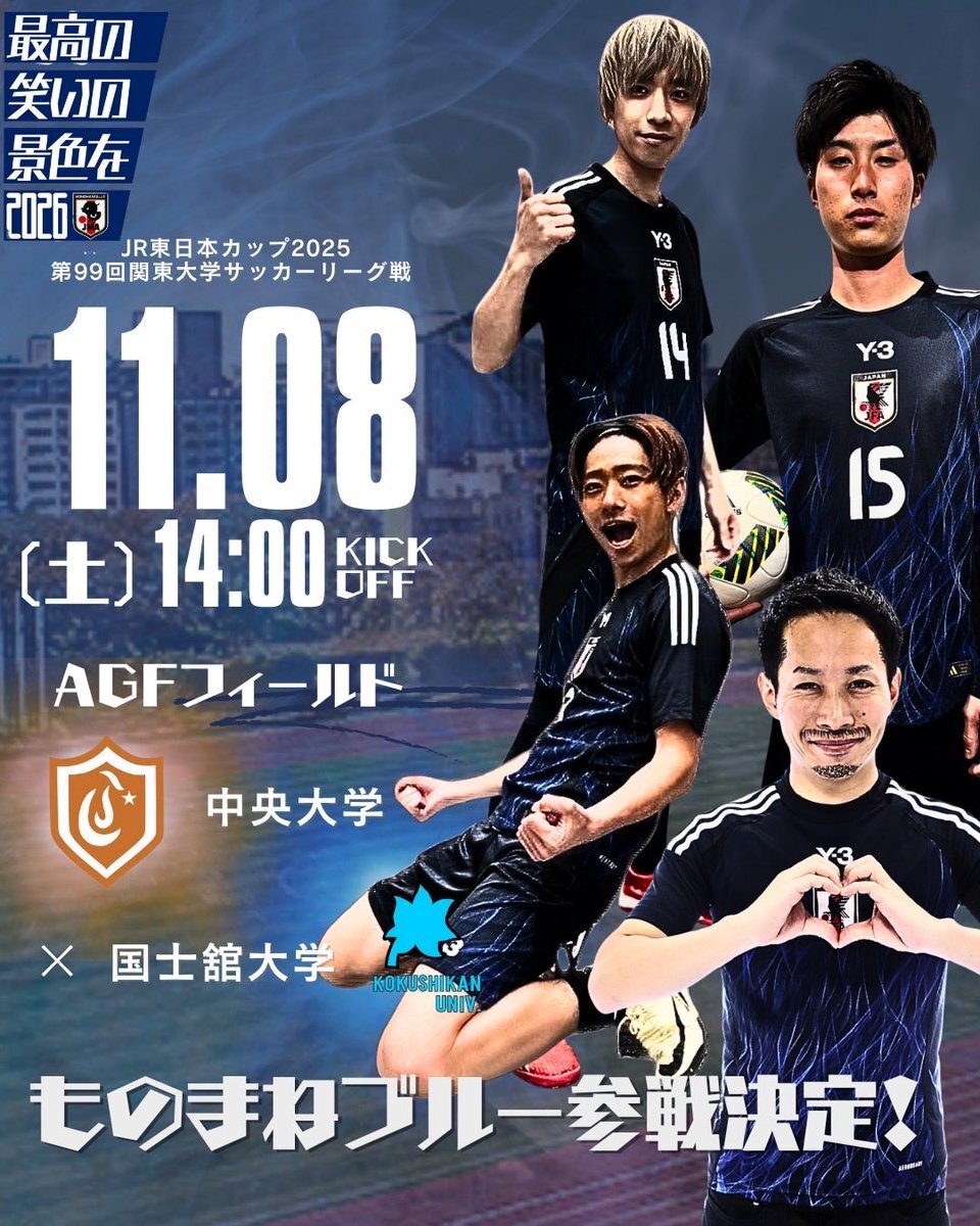 📢お知らせ📢 11月8日 関東大学サッカーリーグ vs 国士舘大学戦にて、、、 ⚽️“ものまねブルー”参戦決定💙 @monomaneblue 【参戦メンバー】 ・似東純也(伊藤純也) ・鎌田大ニ (鎌田大地) ・中村系統(中村敬斗) ・ブラボー!橋本(長友佑都) #中央大学学友会サッカー部 #ものまねブルー