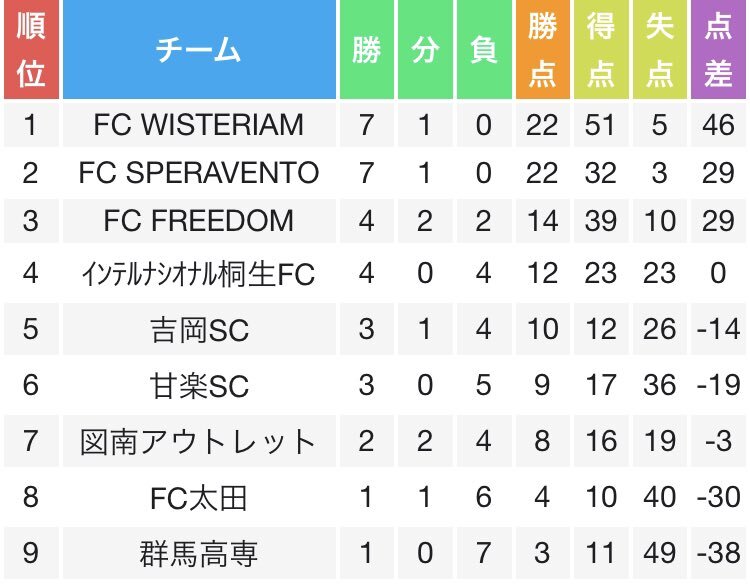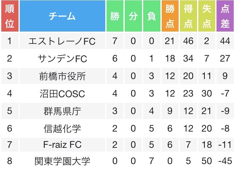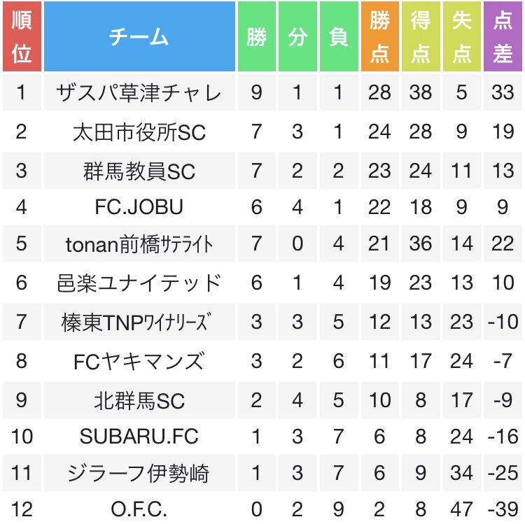 ⚽️#群馬サッカーリーグ 11/9各順位表(更新)📝 【1部】関社1/降格2 日程終了 ザスパチャレが関東社会人サッカー大会へ 11/15㈯ 10:45@南豊ヶ丘(東京) 【2部】昇格2/降格2 一部順延あり 【3部A】昇格1 日程終了 エストレーノが昇格へ 【3部B】昇格1 日程終了 ウィステリアムが昇格へ #コミュサカ x.com/daruma_sato/st…