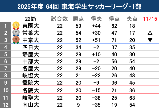 2025年度 64回東海学生サッカーリーグ 🏆1部 第22節 常葉大1-0静産大 中京大1-2東園大 名産大1-1中部大 岐聖大2-1岐協大 名院大4-0四日大 南山大2-5愛院大 常葉大が中京大を勝点で上回り2位フィニッシュ 残留争いの3校は共に勝って順位変わらず愛院大が残留確定 名院大は2部3位名城大と入替戦 pic.x.com/qd38QdKfMK