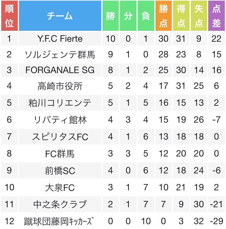 ⚽️#群馬サッカーリーグ 11/16各順位表📝 【1部】関社1/降格2 日程終了☑️ザスパチャレは残留に 【2部】昇格2/降格2 Y.F.Cとソルジェンテが昇格へ、FC群馬残留確定 順延分2試合は11/30 【3部A】昇格1 日程終了☑️エストレーノが昇格へ 【3部B】昇格1 日程終了☑️ウィステリアムが昇格へ #コミュサカ pic.x.com/TocfLIC9Bd x.com/daruma_sato/st…